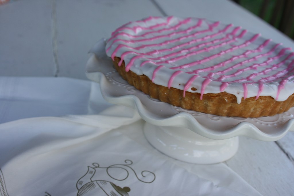 Once you’ve got the jam sorted, simply make a short crust pastry and blind bake the tart shell. After letting it cool, spread the jam over the bottom of the pastry. Cream together the frangipane ingredients and spread that over the jam. Bake, cool and ice; then pipe thin lines of pink icing over the white icing and feather it with a toothpick.