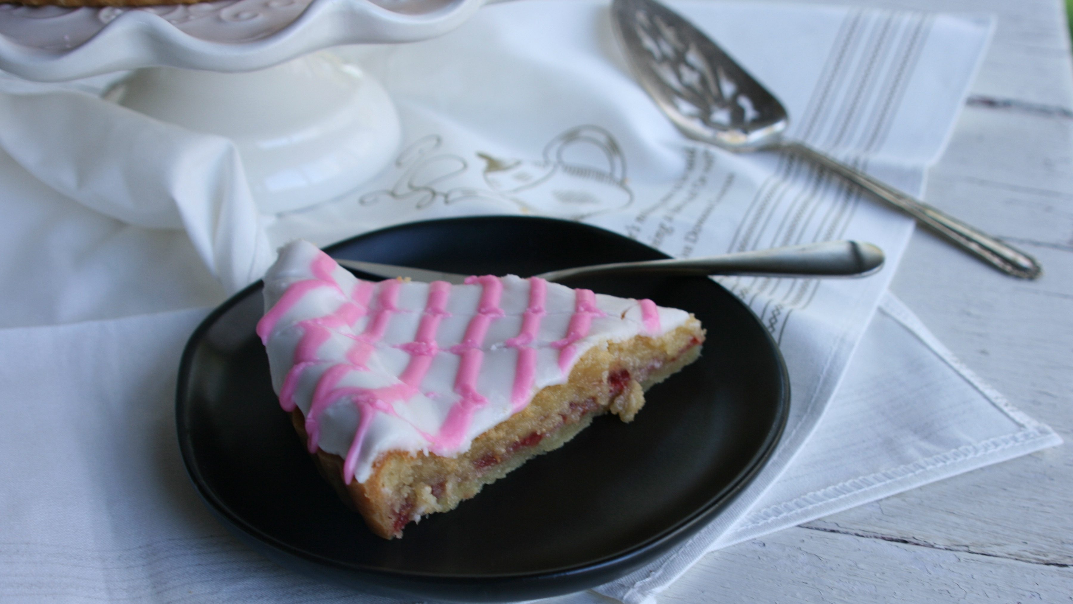 - When the tart has cooled completely, spoon the white icing over the top and spread it to form a smooth surface. Pipe parallel lines of pink icing over the white icing, then drag a toothpick through the lines at a 90 degree angle, alternately dragging from top to bottom and bottom to top, to create a feathered effect. Leave to set, then serve in slices.