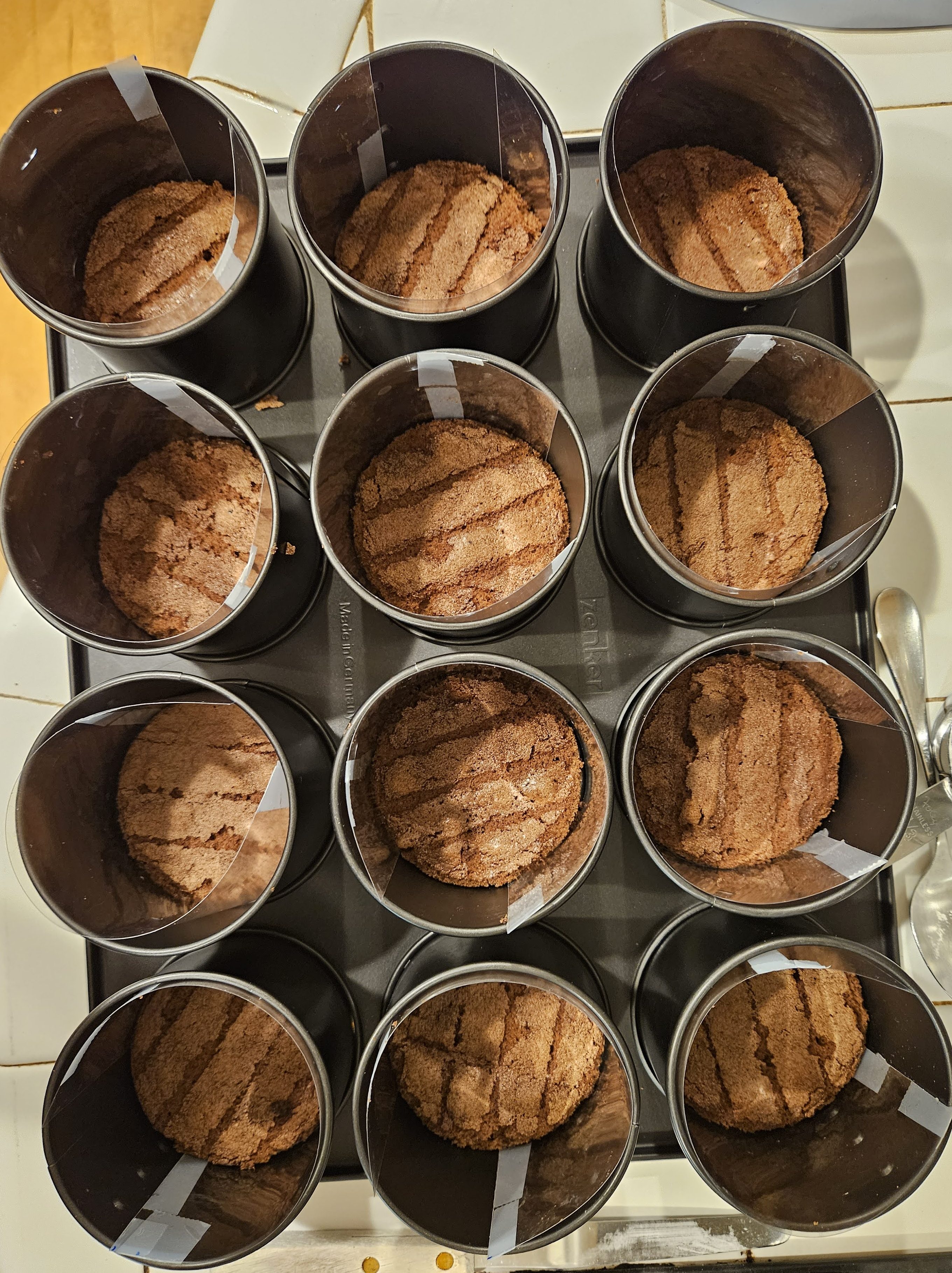 NOTE: You will need 12 individual cake molds or tart tins with removable bottoms. Mine are about 3 inches in diameter and 3 inches tall. You also need acetate strips to line the molds.