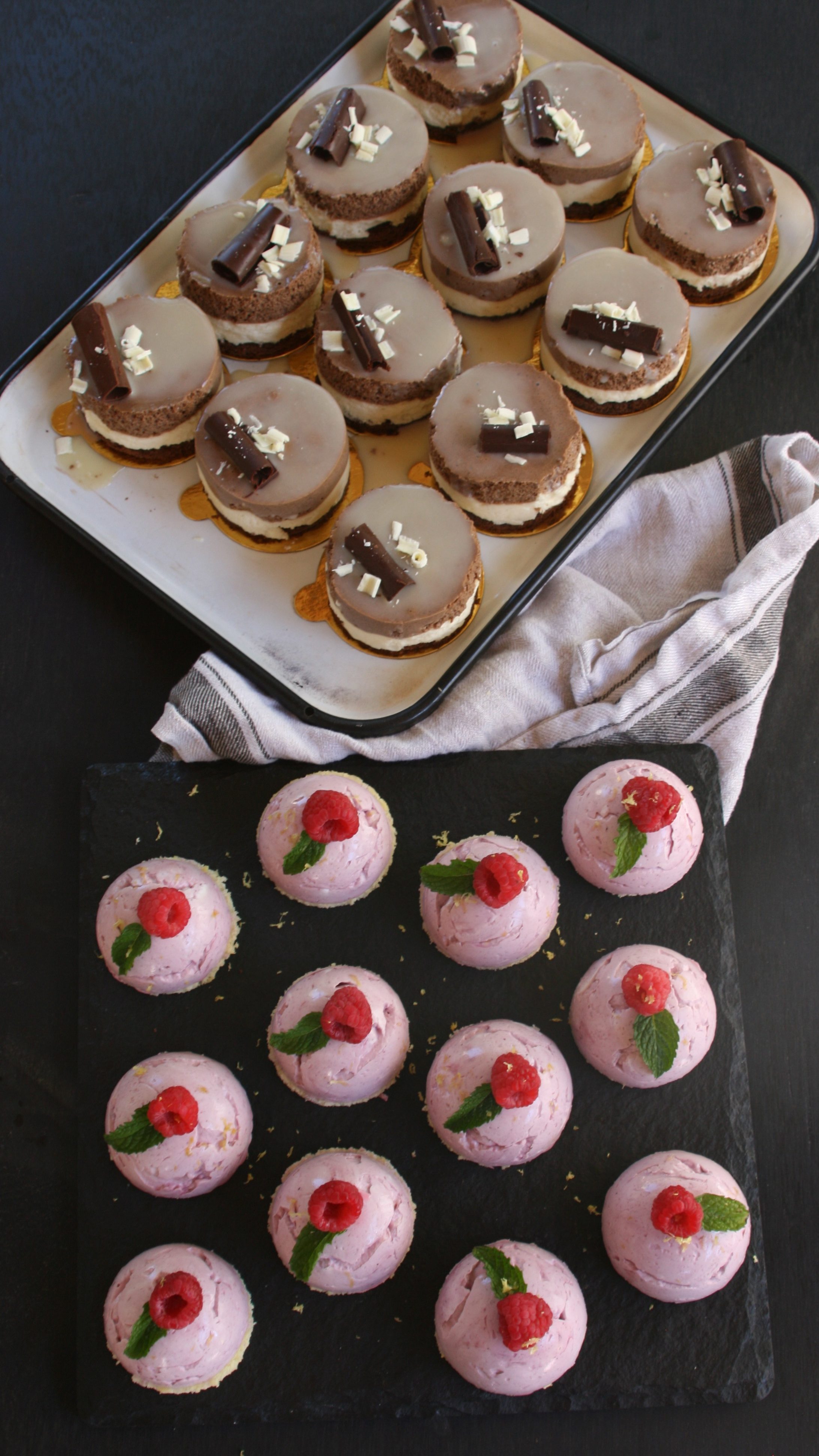 - About half an hour before serving, remove mousse cakes from freezer. Top each with a raspberry and mint leaf and sprinkle with lemon zest.