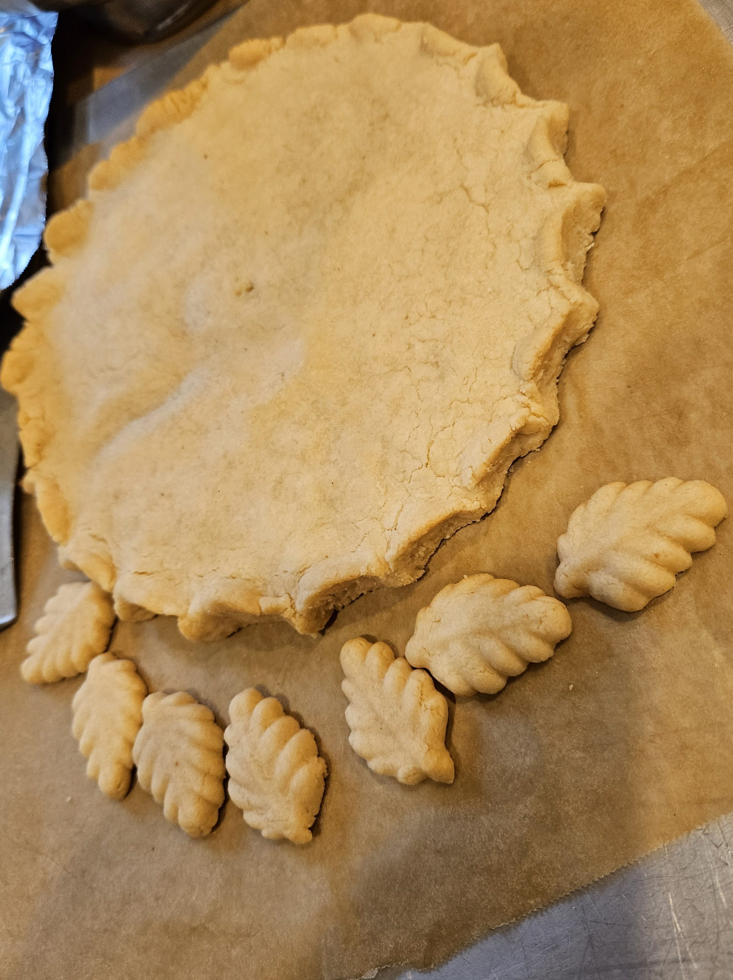 - Lay parchment paper over your work surface and place the dough on top. If it’s too sticky, sprinkle with powdered sugar. Roll out to about ½-inch in thickness. Use a 6-inch plate as a template to cut the dough into a disk. With your thumb and forefinger, flute the edges, much like you would a pie crust. Transfer the disk and the parchment paper to a baking sheet. Reserve any scraps to make decorations.