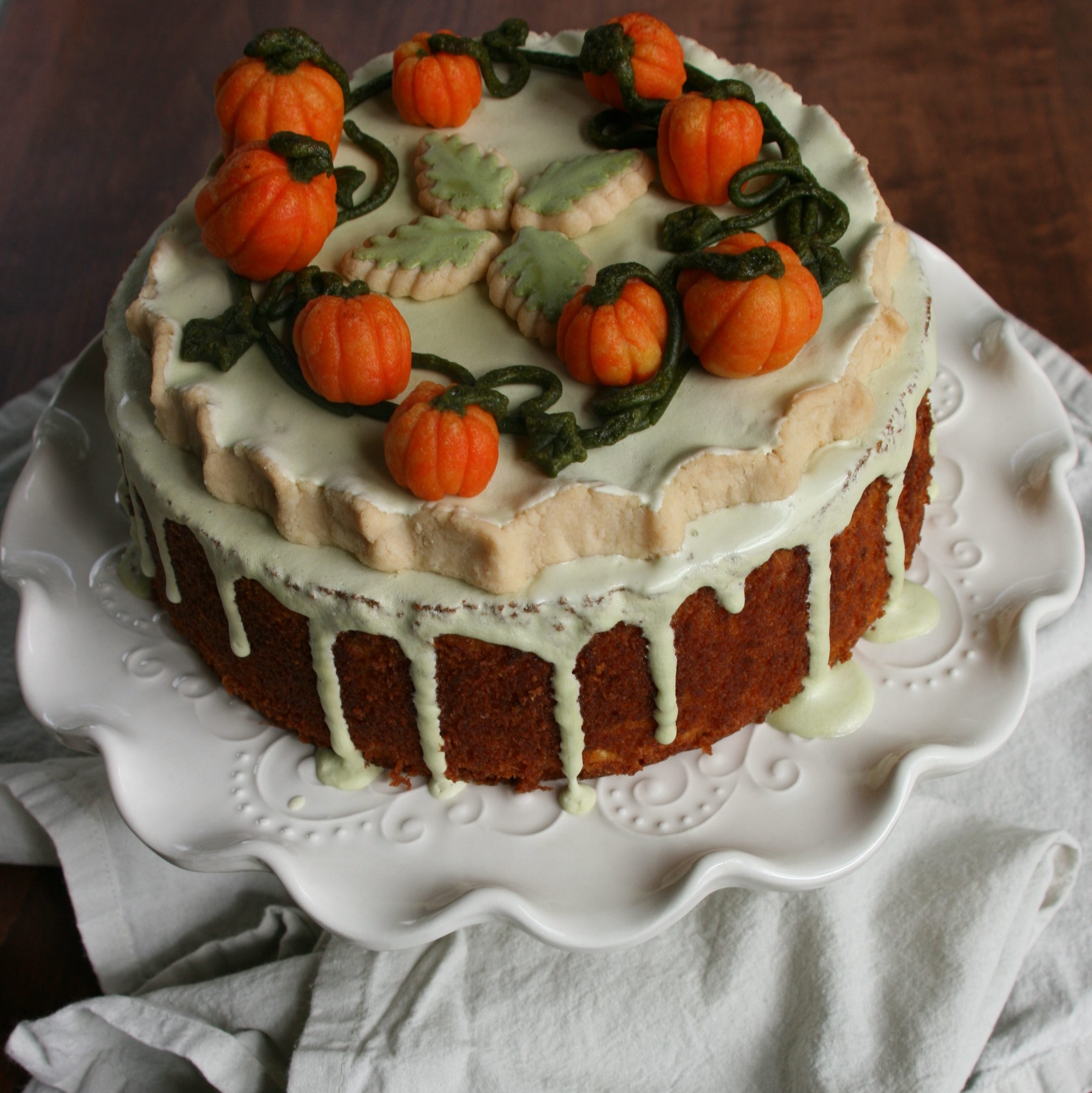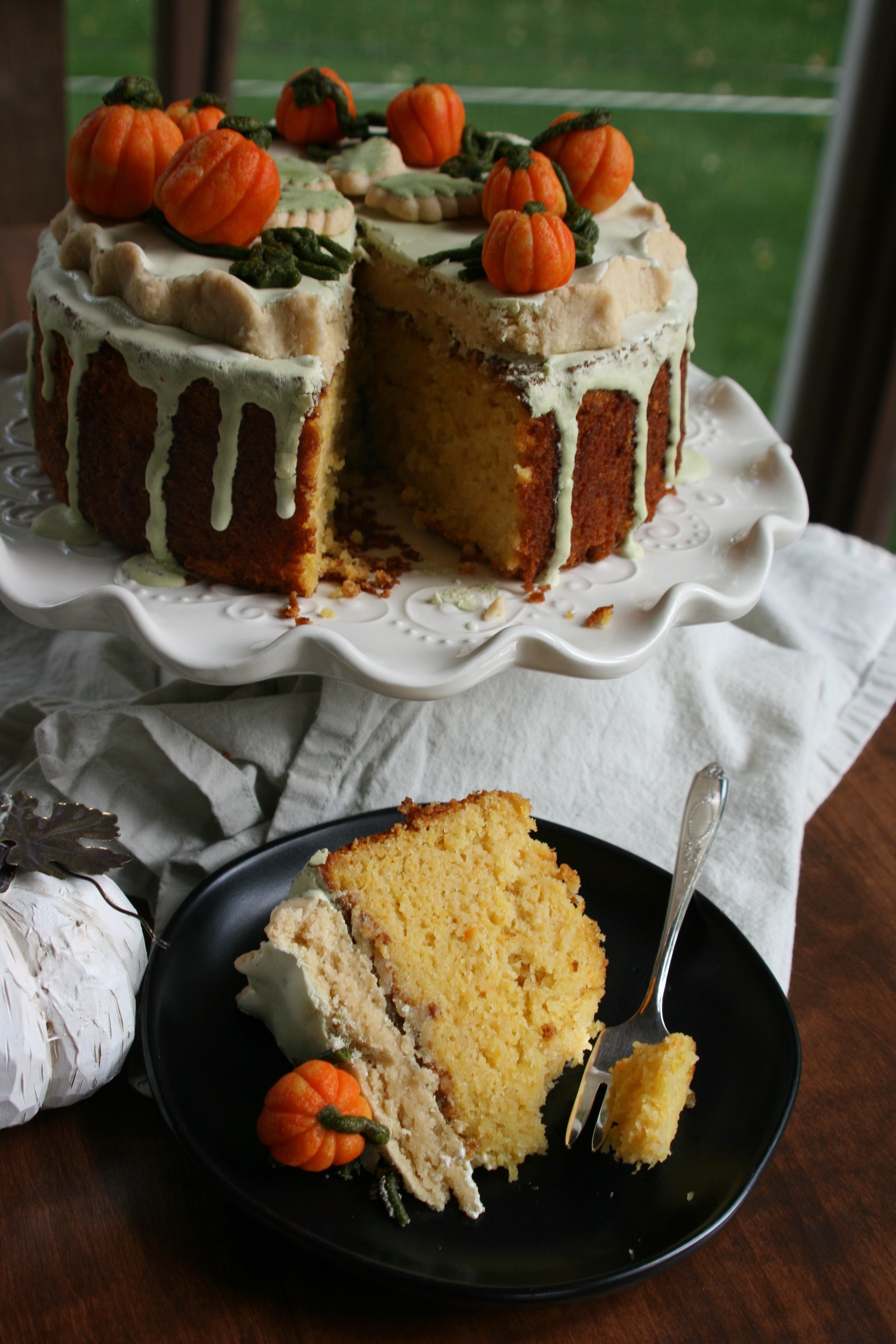 I was able to share my pumpkin patch marchpane cake with several friends and family members, with enough left over for my husband and I to eat over the course of a few days. As I said, the flavor mellows with time, and the marchpane softens as it sits on top of the cake, creating an almost cake-like mini layer. My husband, whose sweet tooth isn’t as developed as mine, said it was better than frosting because it wasn’t as sweet. Like love and fine wine, this bake just gets better with time!