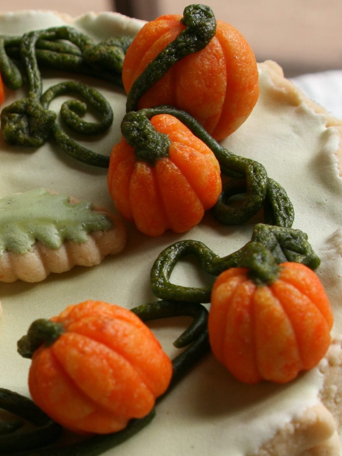 - Line a baking sheet with a piece of aluminum foil. Form the vines into a circle on the foil about 1 inch smaller than the marchpane disk. Arrange the pumpkins in the circle on top of the vines, attaching the ends of some of the vines to the stems of the pumpkins. Curl the other ends and attach a few leaves to the vines. If possible, leave to dry overnight. (Alternatively, place baking sheet under a broiler for 1-2 minutes, watching carefully so the marzipan doesn’t melt. Finish off with a kitchen blowtorch, being careful not to burn the marzipan.)