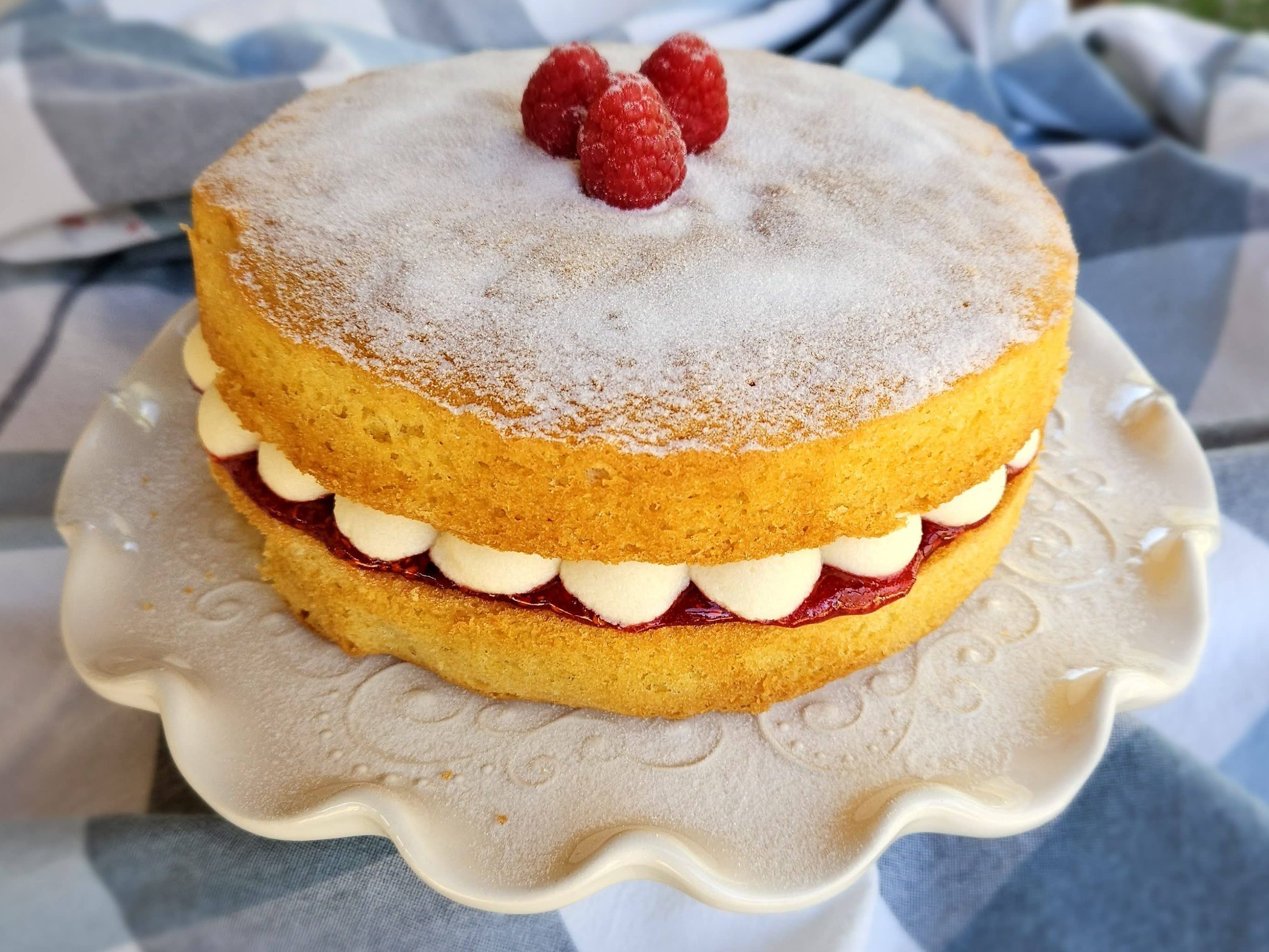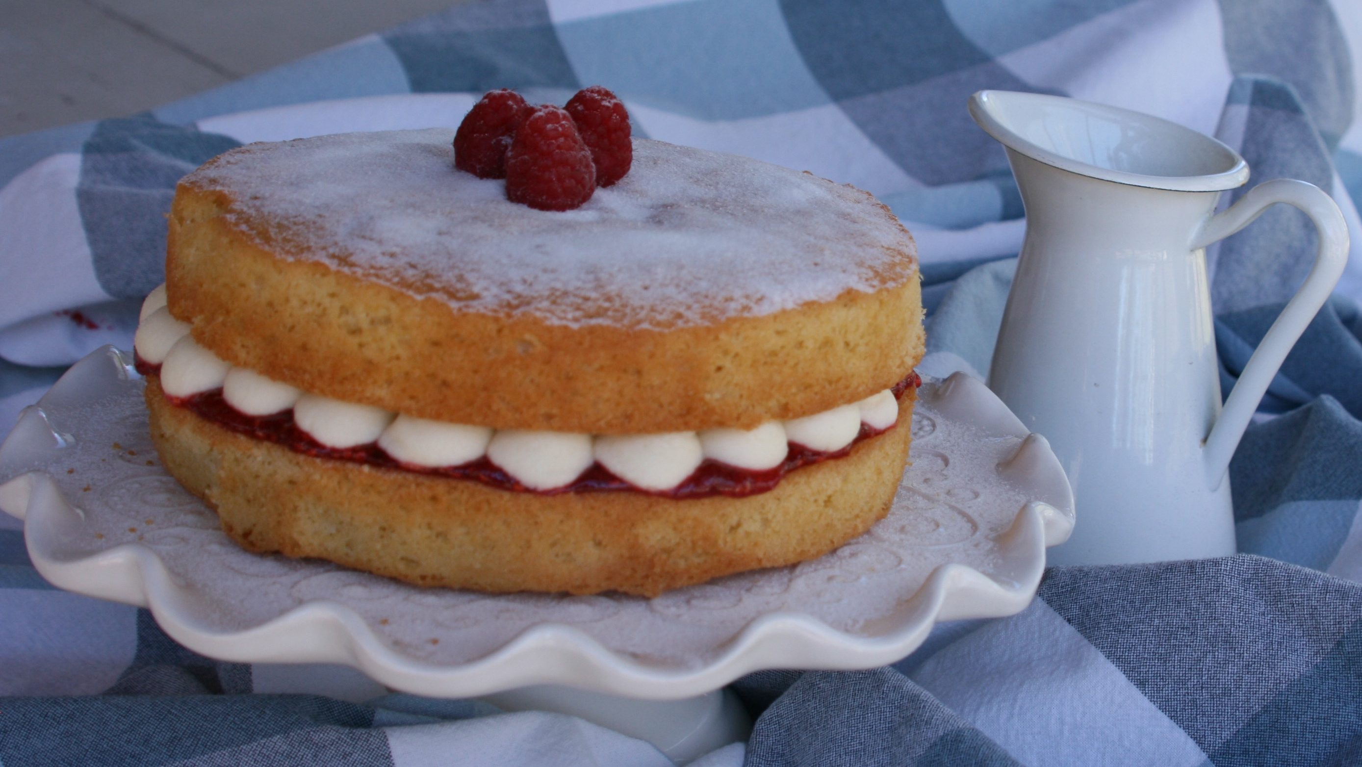 - To assemble, choose the layer with the best top, then put the other layer, top down, onto a serving plate. Spread with the jam, then pipe the buttercream in “kisses” on top of the jam, moving from the outer circle to the center. Place the other layer, top side up, on top of the buttercream, and sprinkle with caster sugar to serve. The cake will keep for 2-3 days in an airtight container at room temperature.