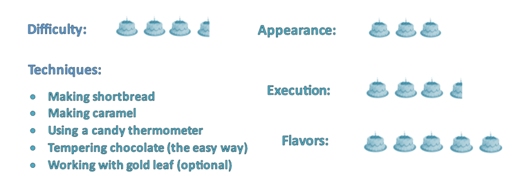 Still, they tasted good. (I mean, you can’t go wrong with the winning combination of chocolate, caramel and buttery shortbread, amiright?) And topped with pistachios that I bedazzled with edible gold leaf, they definitely lived up to their highfalutin moniker. I made sure to share them with friends so as not to be tempted to grab one every time I walked into the kitchen!