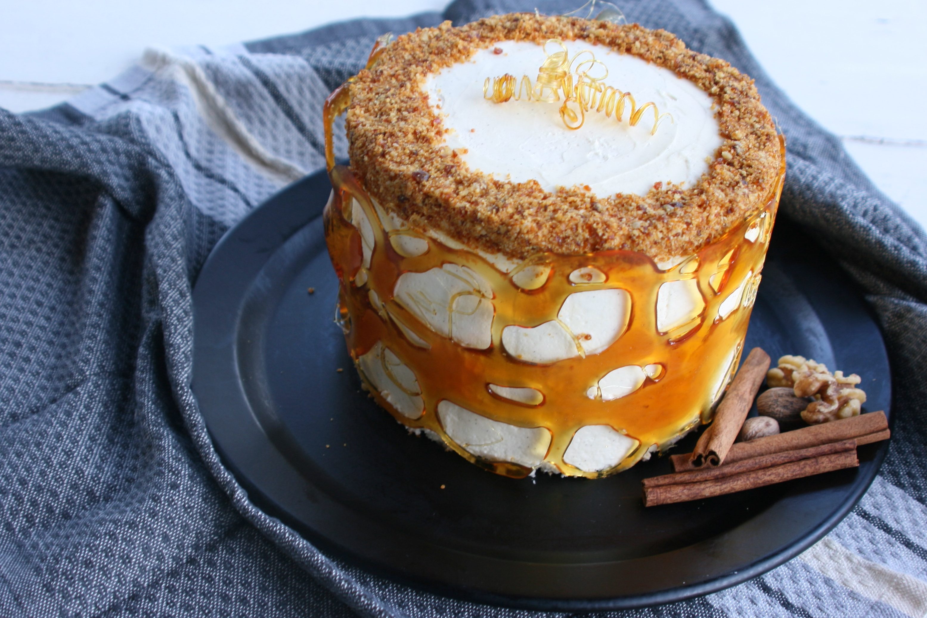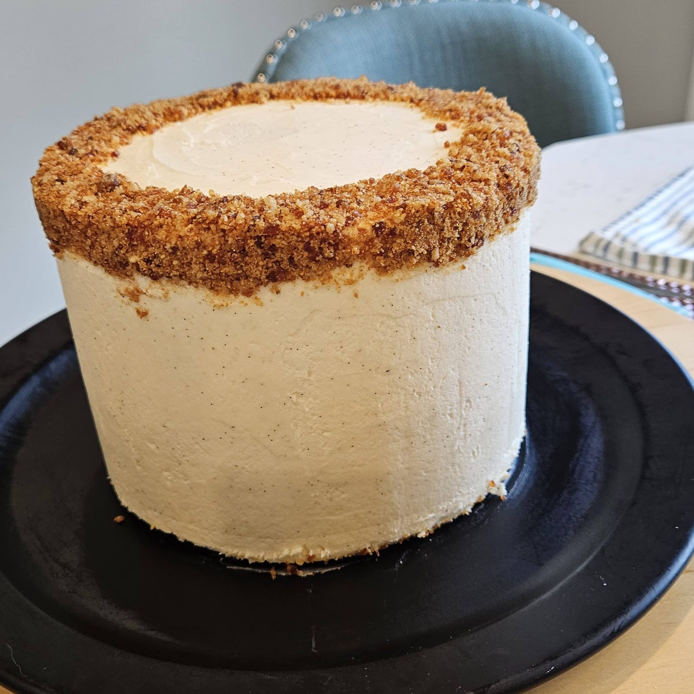 I started with Mary Berry’s recipe for walnut cake that she used for the technical challenge in the 2015 season of The Great British Baking Show. I added my own combination of spices and increased the amount of walnuts to enhance the flavor.