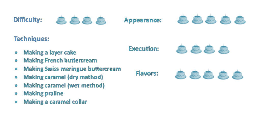Okay, I’ll admit it. I didn’t use spun sugar on this cake. I’ve done spun sugar before, even in my very first showstopper (although I didn’t get it dark enough that first time around). Spun sugar is messy. It gets all over the floor, even when you put newspapers down, and on your clothing. But I did incorporate caramel in other ways: