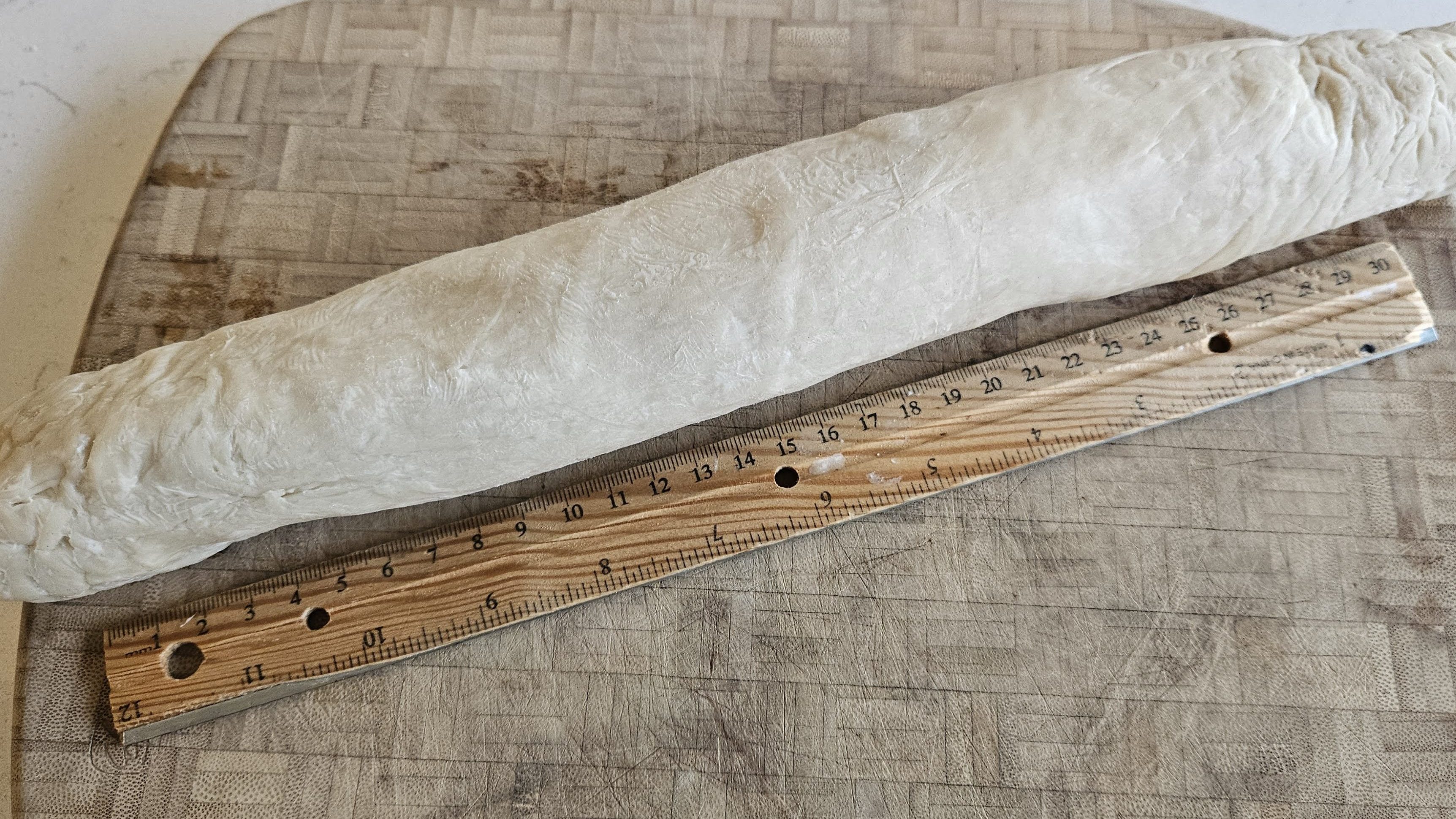 After repeating this process with the rest of the dough and attaching each piece to the previous roll, I had one large log of dough. Even at this stage you can stretch the log to make it longer. You want about a 14-inch log to make 24 sfogliatelle.