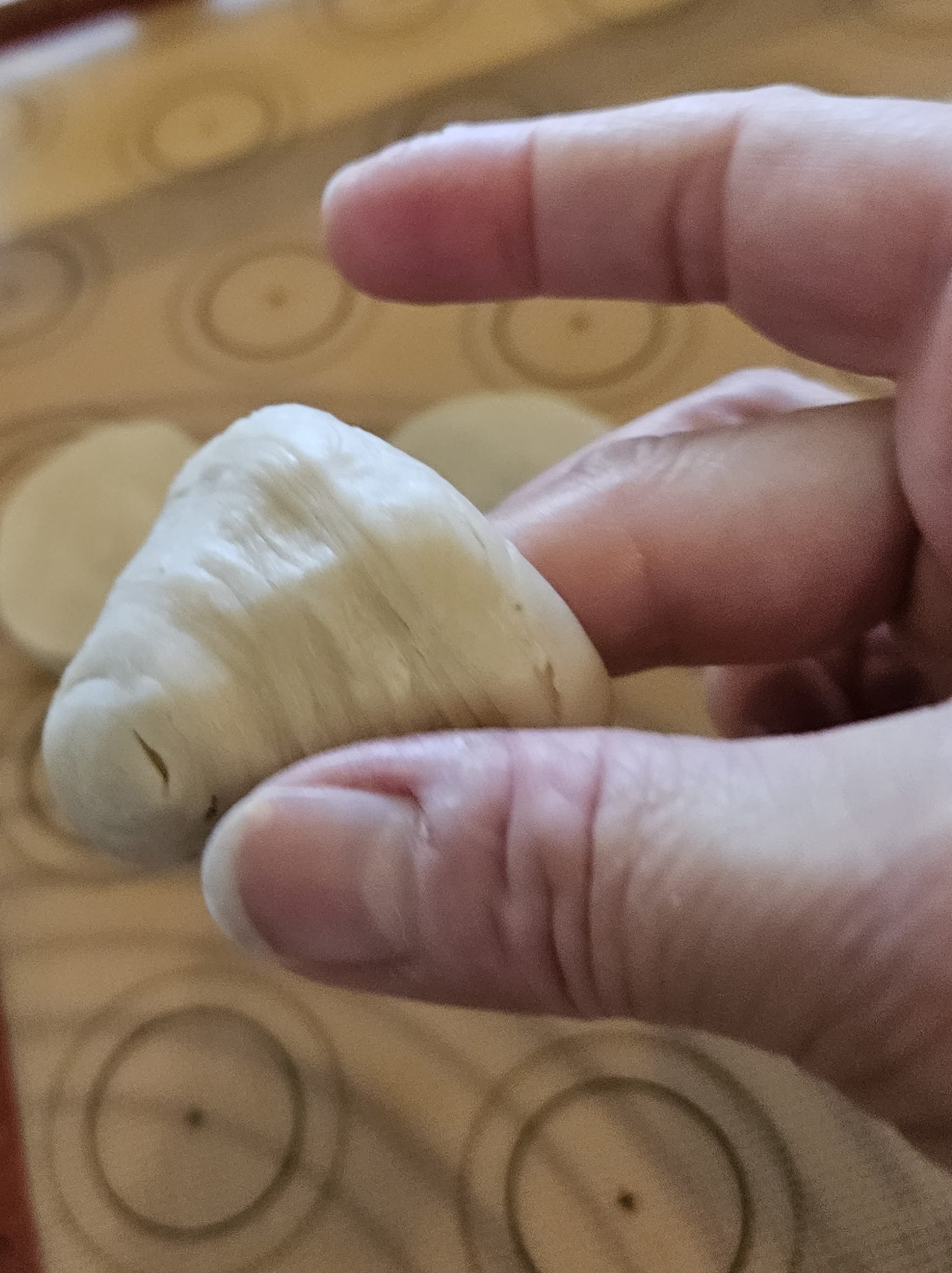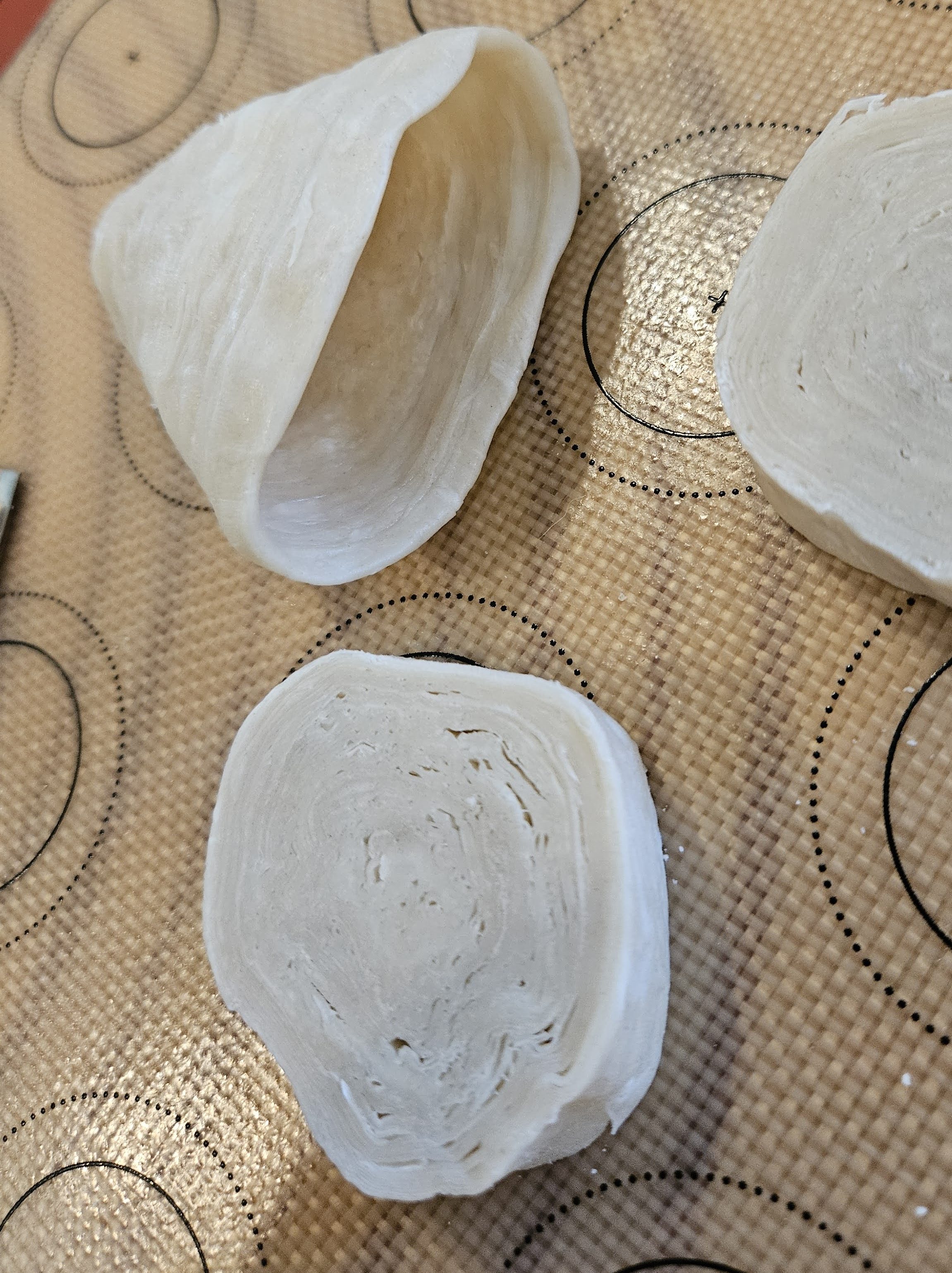 I left the dough log in the fridge overnight, and when I was ready to form the pastries, I cut off the straggly ends and sliced the log into ½-inch disks. Taking one disk at a time, I placed my thumbs in the center and slowly flattened the disk from the center outward, separating the layers and creating a cone-shaped pocket. After piping some of the filling into the pocket, I pinched it closed with my fingers and placed it on the baking tray. When all 24 pastries were assembled, they got one final chill in the fridge for about 20 minutes and then baked at 450°F for 15-18 minutes.