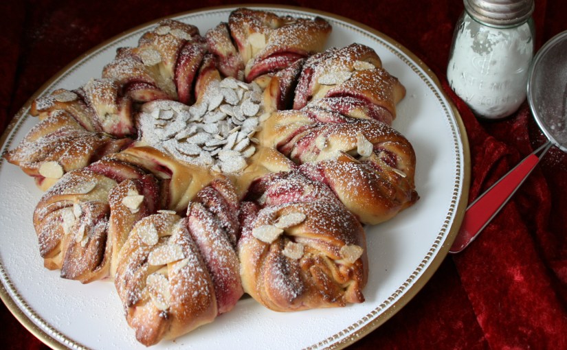 The challenge for this episode of The Great British Bake Off was to make a decorative loaf of any shape or flavor. For my decorative loaf, I decided to make star bread. To twist things up a bit (pun intended), I chose to use two different fillings, raspberry jam and a chocolate almond cream cheese. (Read on…)