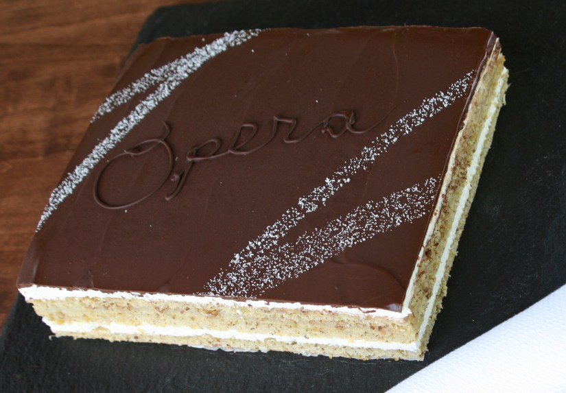The inspiration for my opera cake came from the popular ’70s dessert, the Watergate cake. My interpretation of the Watergate cake in operatic form was to make a pistachio joconde sponge brushed with a pistachio syrup and layer it with coconut Swiss meringue buttercream and pineapple filling studded with pecans. I finished it off with a thin chocolate glaze. (Read on…)