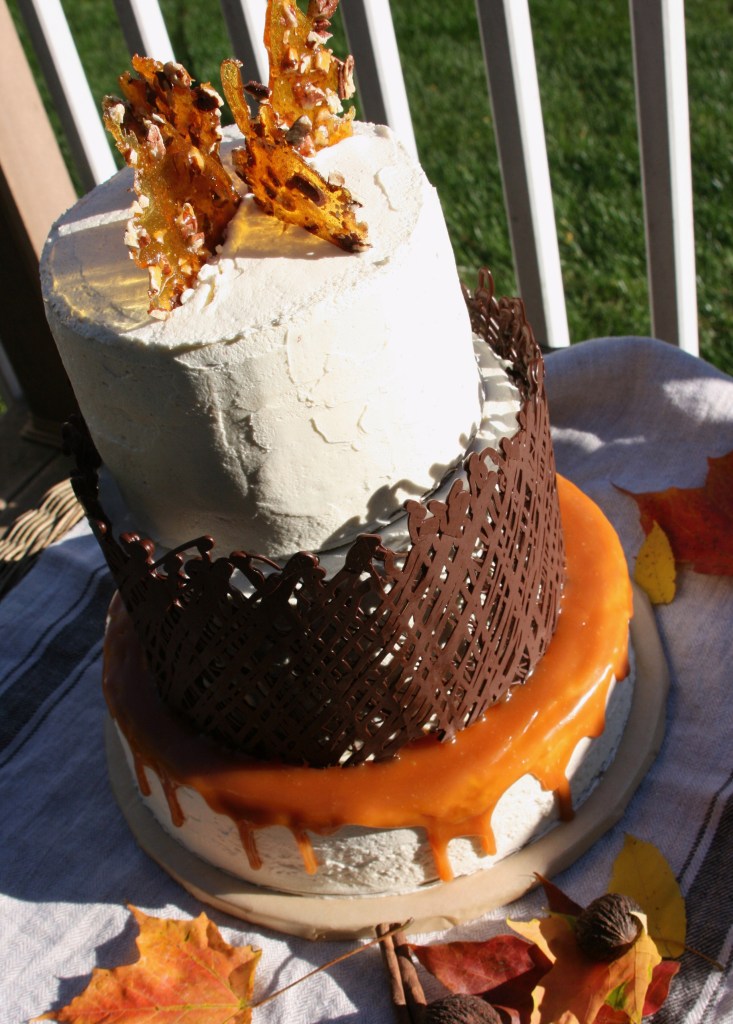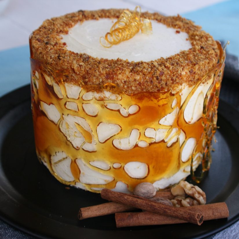 This walnut spice cake filled with a coffee crème au beurre complements the caramel and praline decorations, while the cream cheese Swiss meringue buttercream frosting provides a tangy, creamy finish to the overall flavor profile. The unique caramel collar adds a creative touch that gives the whole thing an artistic flair!