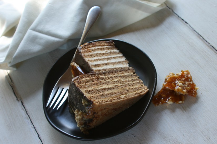 Dobos torte is generally made with five to seven thin cake layers filled with chocolate buttercream and topped with caramel. My coffee and walnut Dobos torte consists of two tiers of six layers each, one filled with coffee buttercream and one with praline buttercream. The cake is flavored with finely chopped walnuts and covered in chocolate ganache.