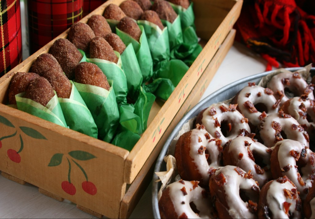 Doughnuts have strong ties to Americana, from the Donut Dollies of World War II to the invention of the automatic donut-making machine. So my doughnuts are inspired by another slice of Americana — the state fair. Invoking flavors of local produce and home-baked goods, these are my maple-bacon doughnuts and sweet-corn doughnuts with spiced apple filling!