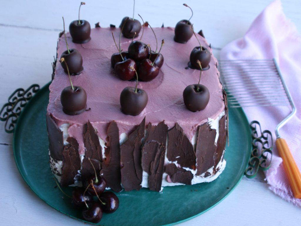 Black Forest cherry cake is made of multiple layers of chocolate cake filled with cherries and whipped cream, garnished with additional cream, cherries and chocolate. My retro interpretation incorporates a chocolate chiffon cake and dark sweet cherries with the traditional German flavor of kirschwasser.