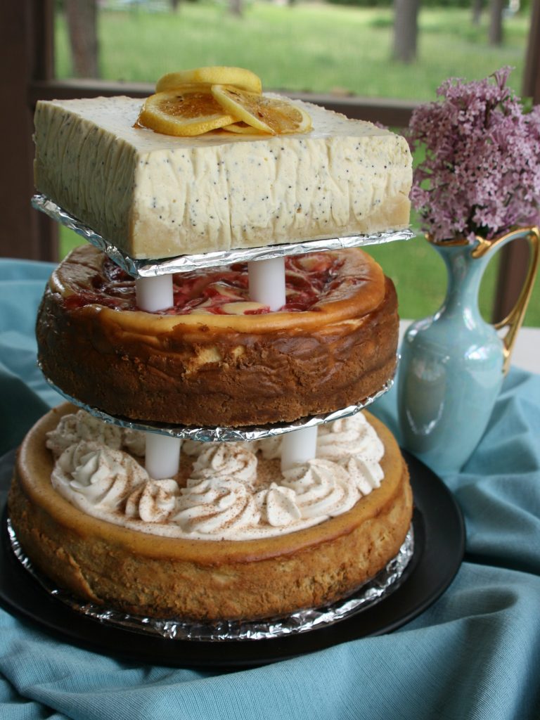 For my three-tiered cheesecake, I chose three different flavors with a different cookie-crumb crust for each: Pumpkin spice cheesecake with a gingersnap crust, rhubarb ripple cheesecake with a speculoos (a.k.a. Biscoff cookie) crust, and lemon poppyseed cheesecake with a shortbread cookie crust. I topped the pumpkin spice cheesecake with a whipped cream/sour cream mixture, and the lemon cheesecake with brûléed lemons. The rhubarb ripple cheesecake needed no topping; the ripple gave it a pretty, two-toned appearance and provided a burst of tangy, juicy rhubarb in every bite.