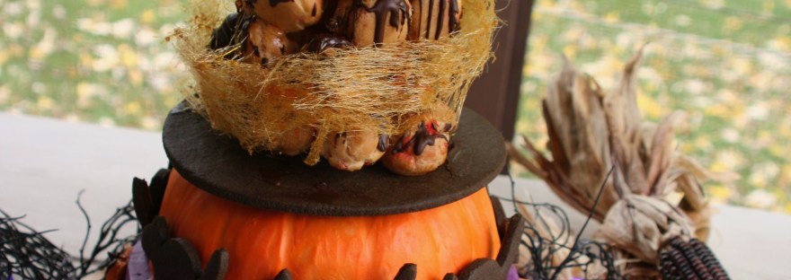 The pièce montée was the pièce de resistance for the 2014 season of the Great British Bake Off. I dubbed mine The Magic of Halloween. It features a dark chocolate cake with cherry filling topped with a pumpkin cake, which in turn is topped with a croquembouche. The profiteroles in the croquembouche are filled with orange pastry cream, drizzled with dark chocolate and spiraled with spun sugar. Spiced macarons and gingerbread black cats round out this tower of treats.