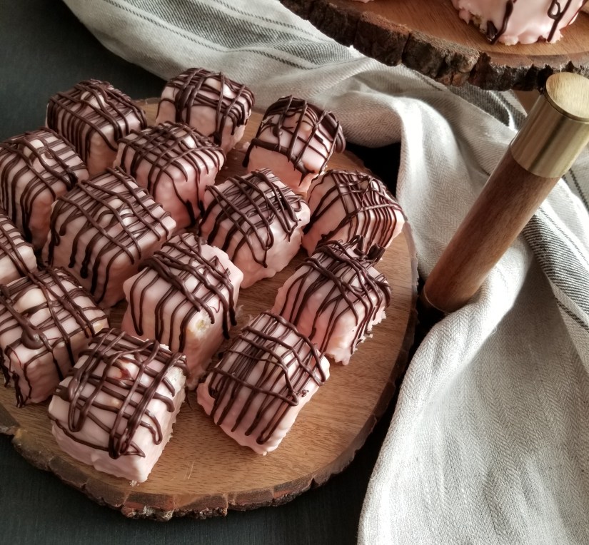 These mini Swiss rolls are reminiscent of Hostess Ho Hos, Little Debbie Swiss Rolls or, in the UK, Cadbury’s Mini Rolls — but with the added kick of peppermint! A thin, chocolatey, light sponge is spread with mint buttercream and rolled up like a tiny Swiss roll, then enrobed in melted chocolate.