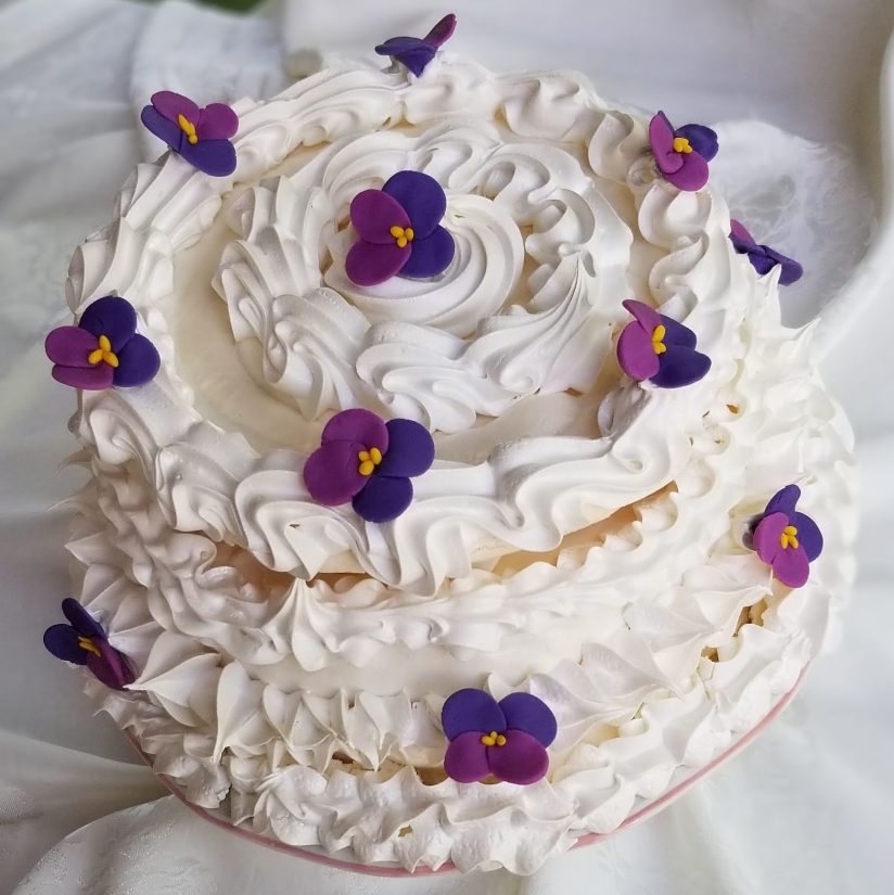Mary Berry’s walnut layer cake features three layers of light, moist sponge with bits of walnut throughout, filled with vanilla buttercream and covered with what she calls boiled icing but what I recall from my childhood as seven-minute frosting. This fluffy, white, meringue-like frosting is not boiled at all, but whisked over a pan of simmering water until it forms a marshmallowy consistency.
