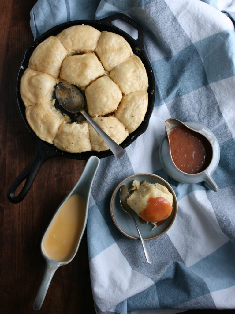 Dampfnudel, literally translated steam noodle, is more like a dumpling than a noodle. Some are sweet, often filled with fruit or served with pouring custard or fruit sauce. Others are savory, served in soups or covered with goulash, sauerkraut, or vegetables and gravy. These are made from Paul Hollywood’s recipe, with an enriched dough scented with lemon zest and served with two sauces, créme anglaise and a sweetened plum sauce. The steamed sweet rolls are exactly what comfort food should taste like — soft and warm, not too sweet, but very filling.