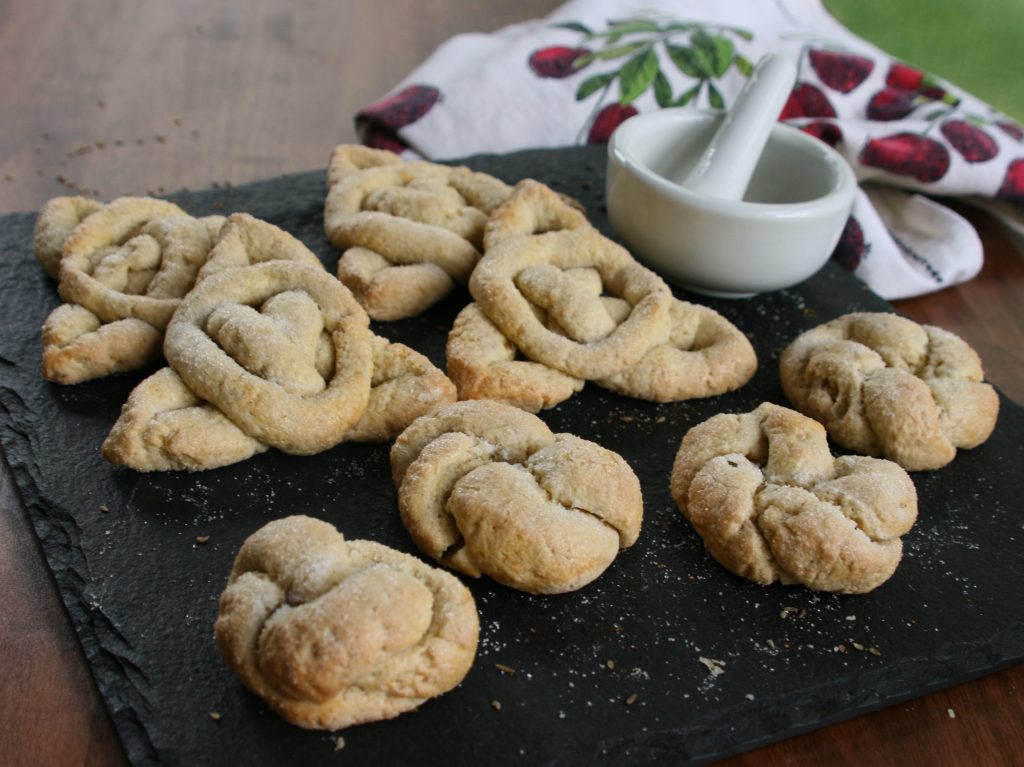 Dating back to the Middle Ages, jumbles are considered the precursor to our sugar cookies of today. They are denser than modern cookies, having been invented before the introduction of baking powder, but they were also known to be sturdy enough to keep for a year or more, making them a popular food for travelers. Paul’s recipe combines the flavors of caraway, aniseed, mace and lemon zest. I usually associate caraway more with savory dishes than sweet, and I’m not a big fan of the licorice flavor of anise, but the combination of these flavors is mildly reminiscent of nutmeg and reminds me of a sugar cookie recipe my mom used to make that called for sour cream and nutmeg.